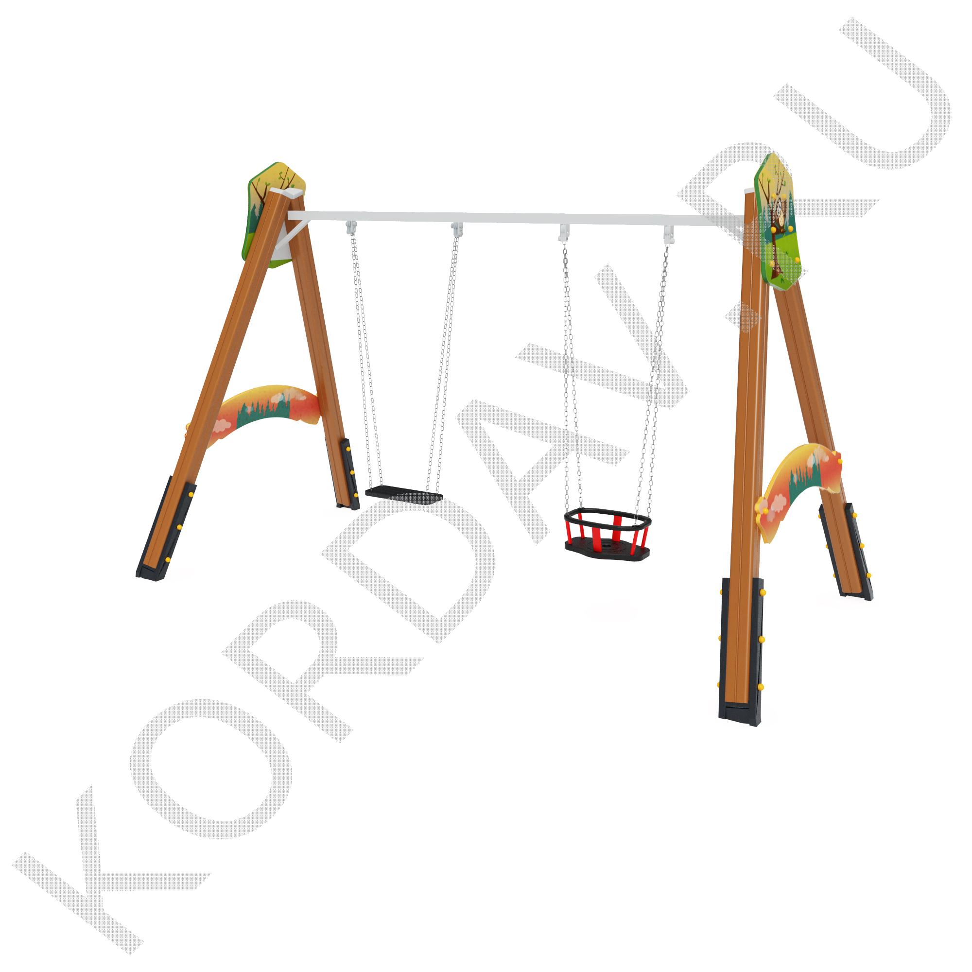 Качели оборудованы декоративными элементами для крепления двух сидений. Основание качелей сделано из клеенного бруса который скреплен болтами, для связки которых используются фанерные пластины с декоративными вырезами по краям. Горизонтальная труба служащая для крепления подвеса крепится к связке опорных брусьев и связывается небольшой трубой сделанной в форме дуги. Качели крепятся в четырёх точках, брусья крепятся в распор относительно центра конструкции.