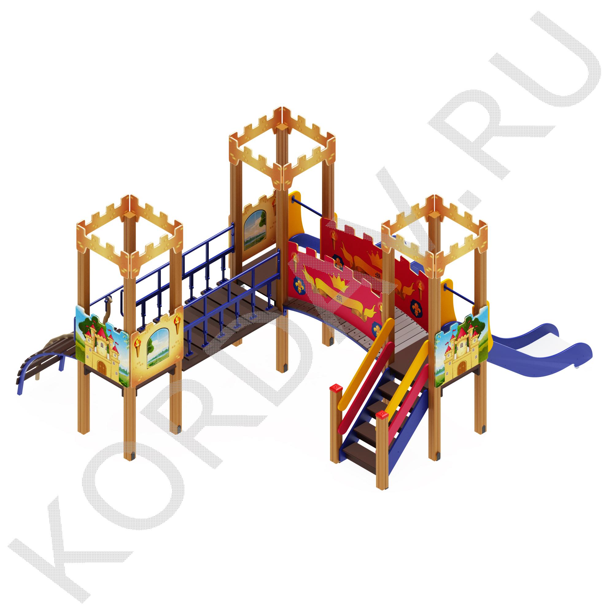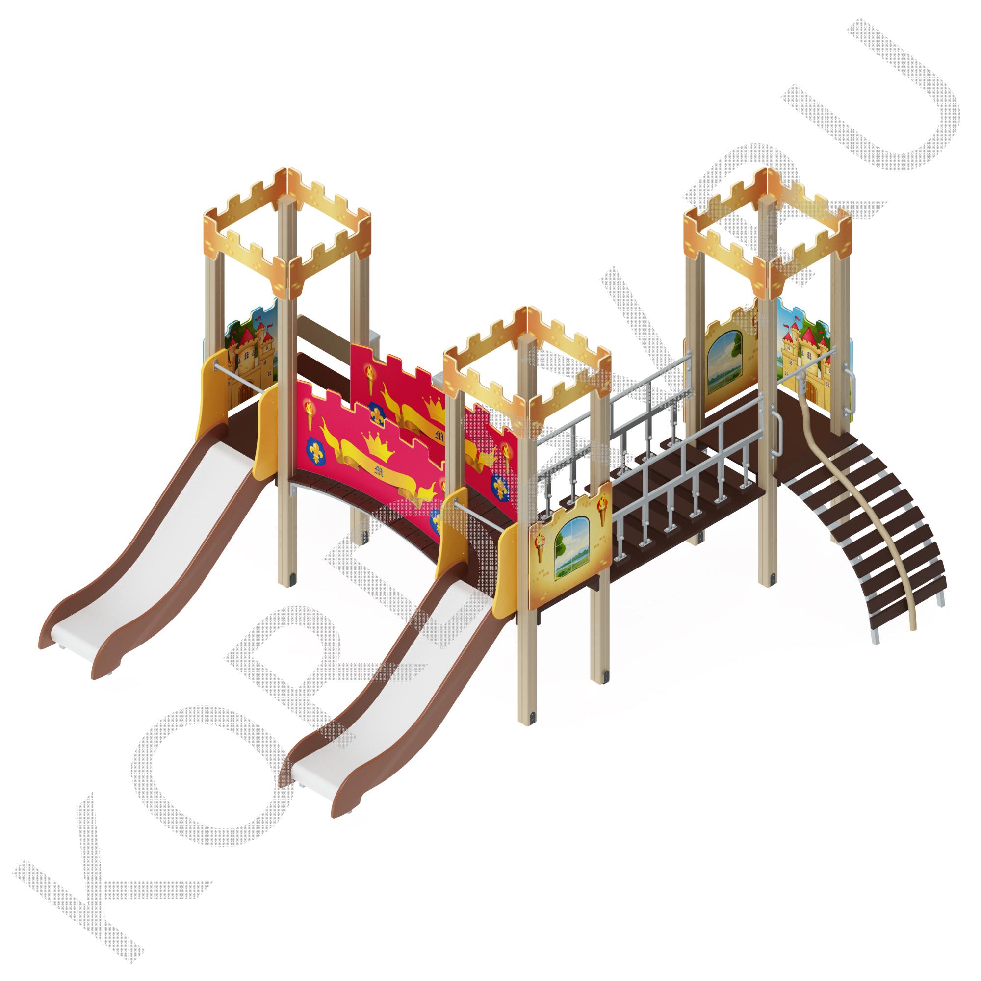 Детский игровой комплекс с трапом – это небольшой сказочный город в своем дворе. В конструкции сочетаются элементы для игры и занятий спортом. Площадки с ограждениями, расположенные на двух уровнях, позволяют детям выбрать занятие по душе. Любителям горок легко подниматься по широким ступенькам. Желоб достаточно широкий, имеет ограждение бортиками. Рядом трап, который дополняет веревка-канат. Все надежно крепится, обеспечивая безопасность на годы.